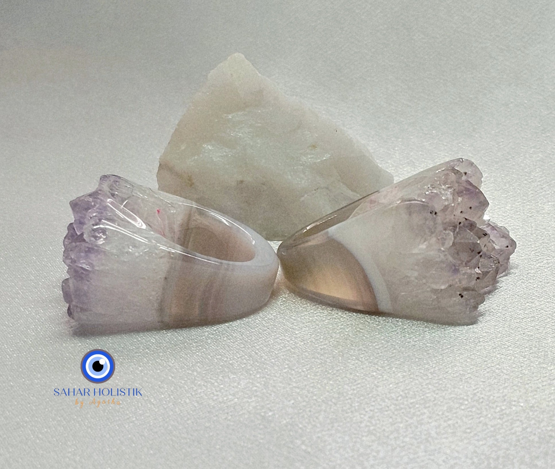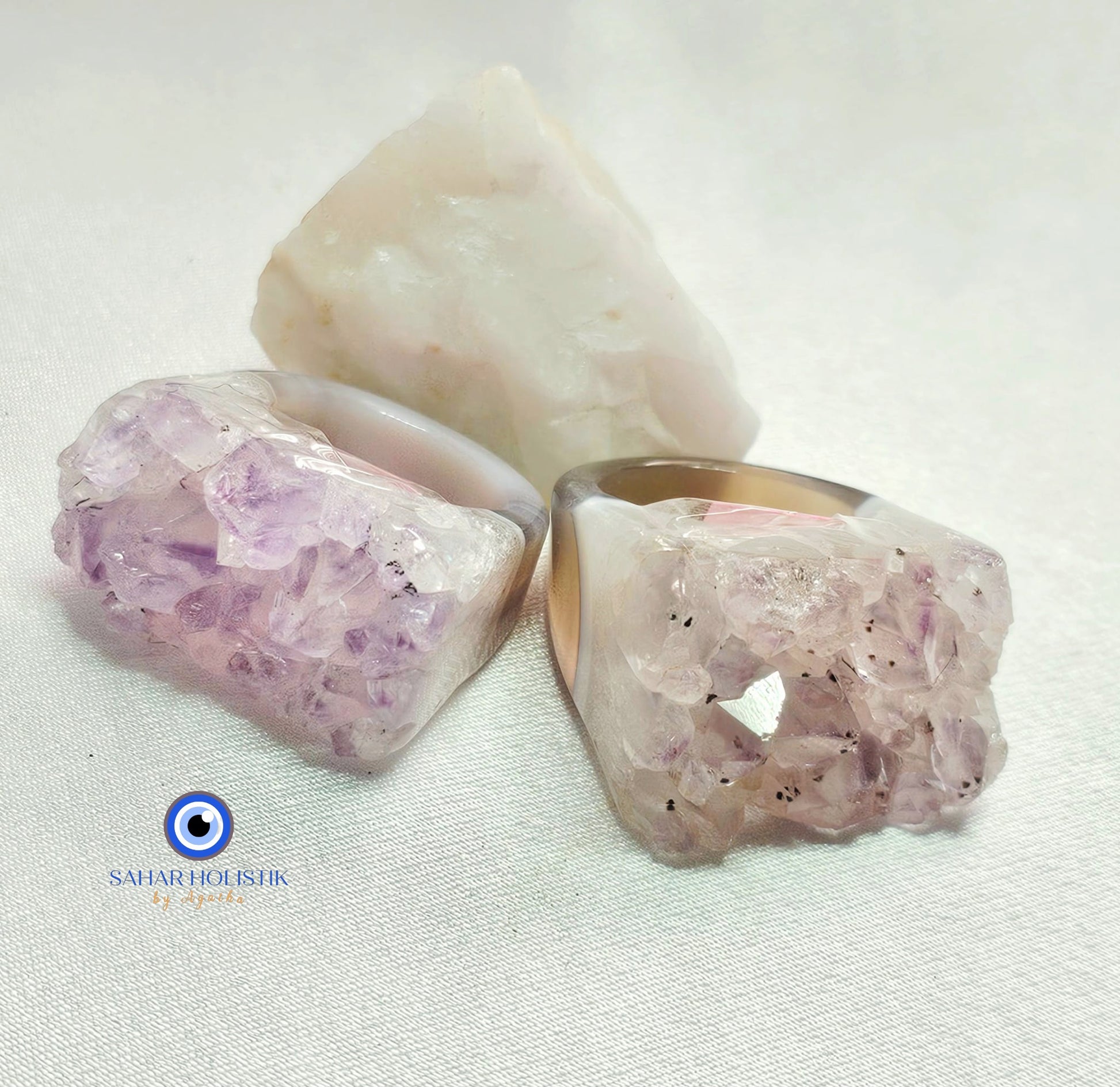 Sortija en Druzy Amatista. Poderosa y protectora, con elevada vibración espiritual. Transmuta la energía en amor y bloquea las energías ambientales negativas. Tranquilizante natural, potencia los estados elevados de conciencia y meditación.